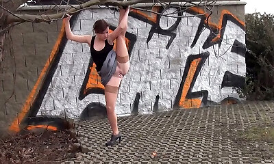 A flexible blond nymph is doing some acrobatic tricks in a park