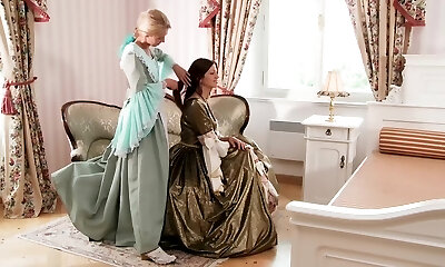 Three glorious lesbians in a castle get aroused and then they smash on the throne chair
