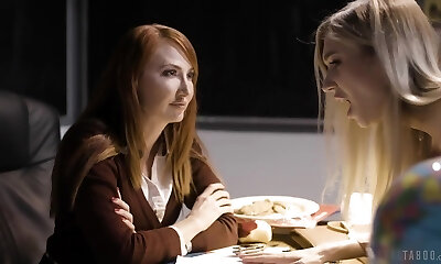 Blonde nubile stunner is seduced and eaten out by a mature lesbian