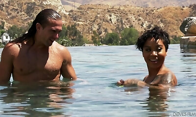 Nude ebony babe Lala Ivey is swimming in the pool before a insane lovemaking with her white neighbor