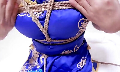 Her palms and ankles are roped together as he drills her