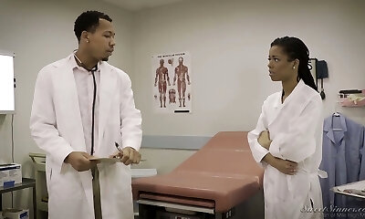 Horny and hot black doctor flashes her tits before patient fucks her mish