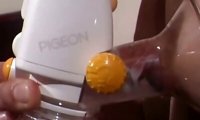 A girl with huge puffies pumps and toys her vagina